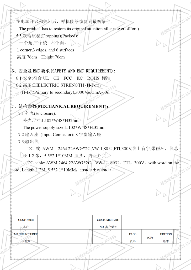 19V3.5A電源適配器規(guī)格書