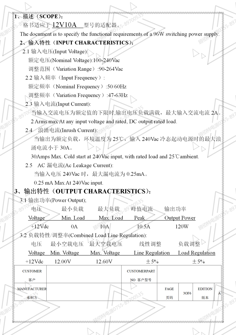 12V1.25A電源適配器規(guī)格書(桌面式)