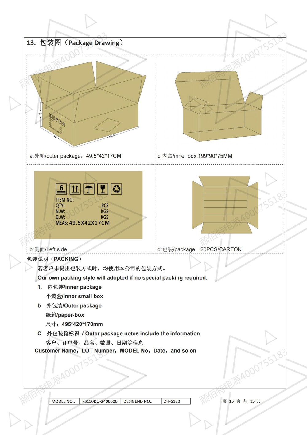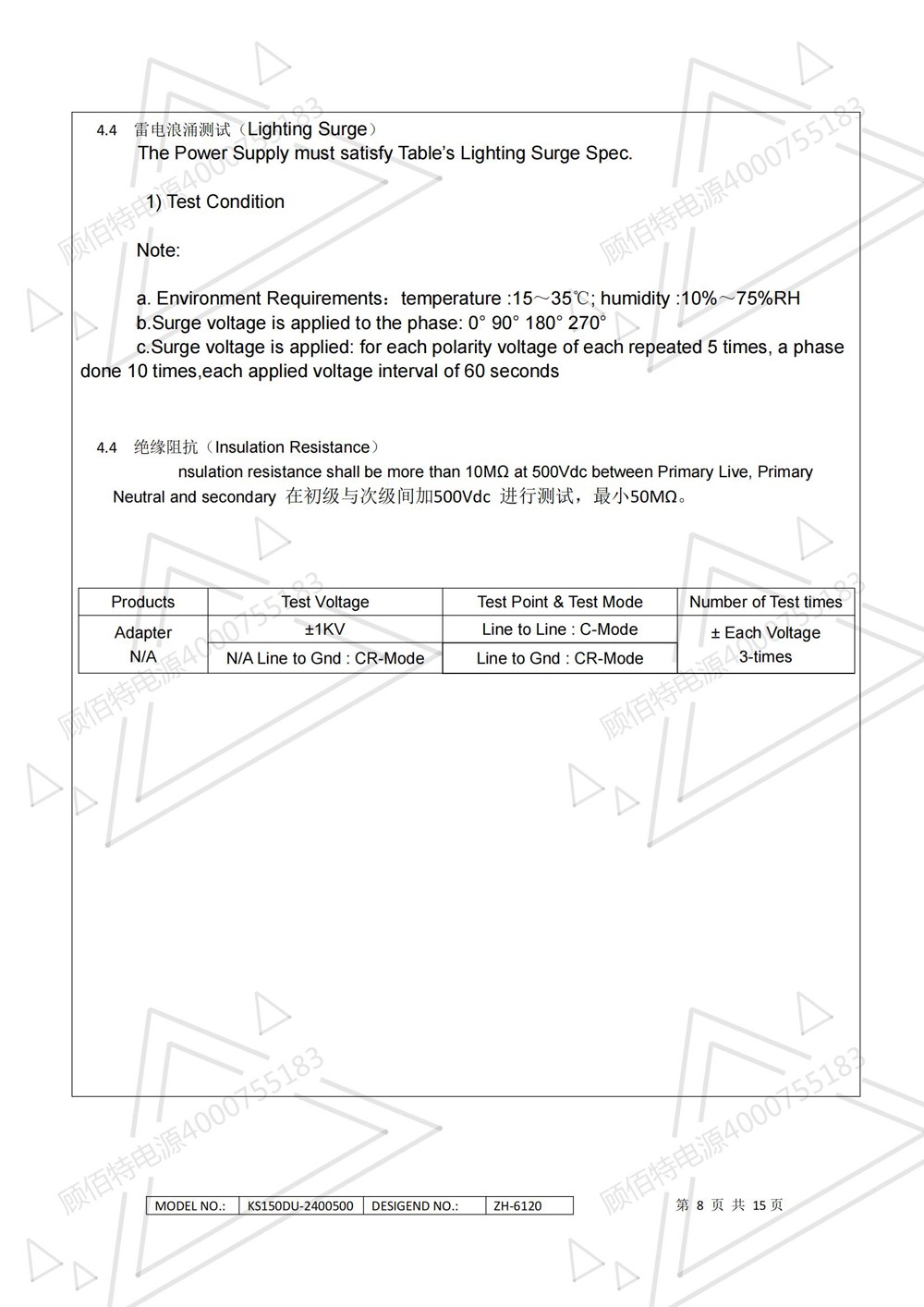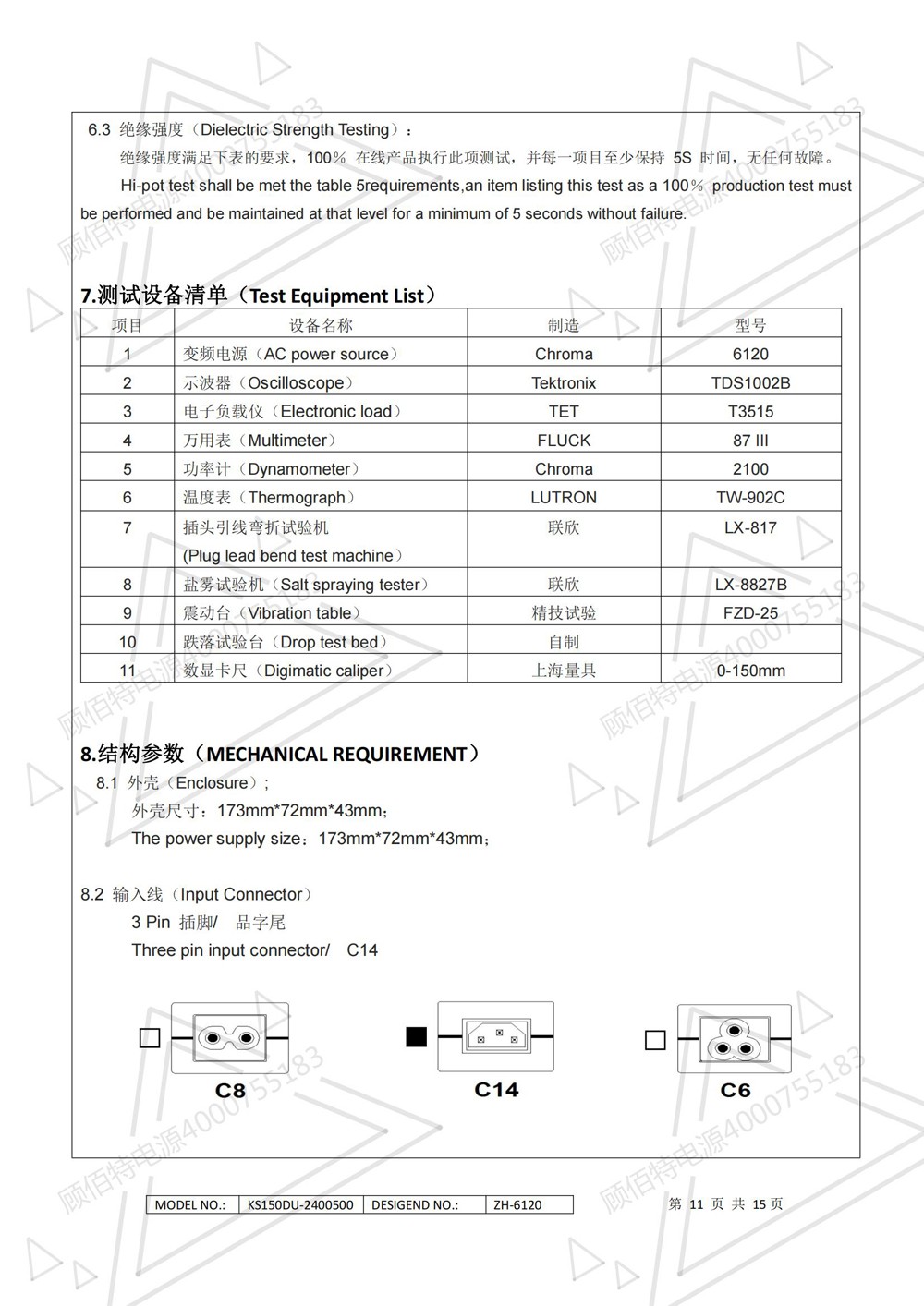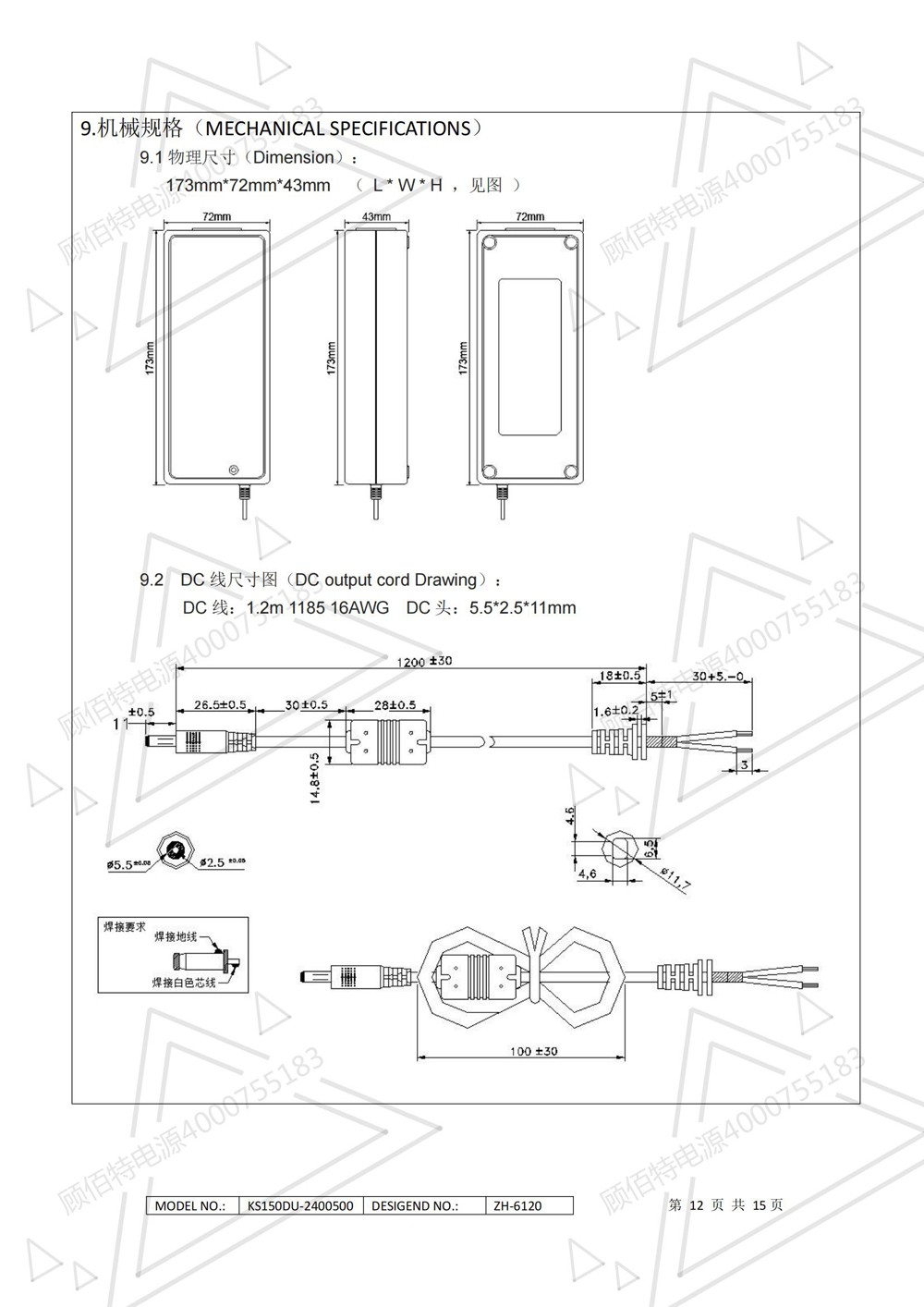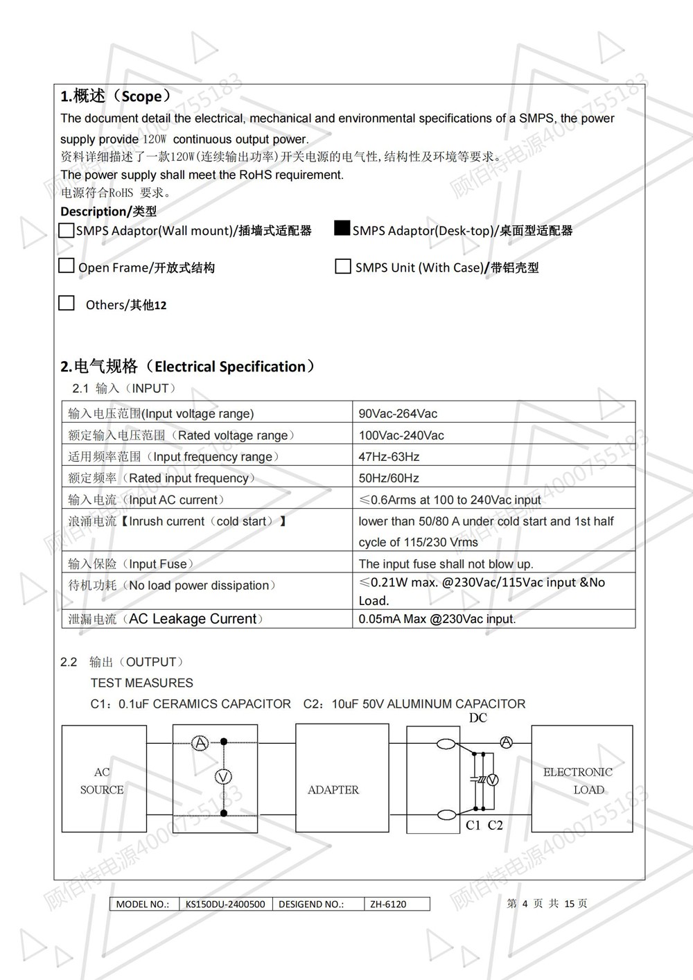 24V5A電源適配器規格書資料詳細描述了一款120W(連續輸出功率)開關電源的電氣性,結構性及環境等要求。